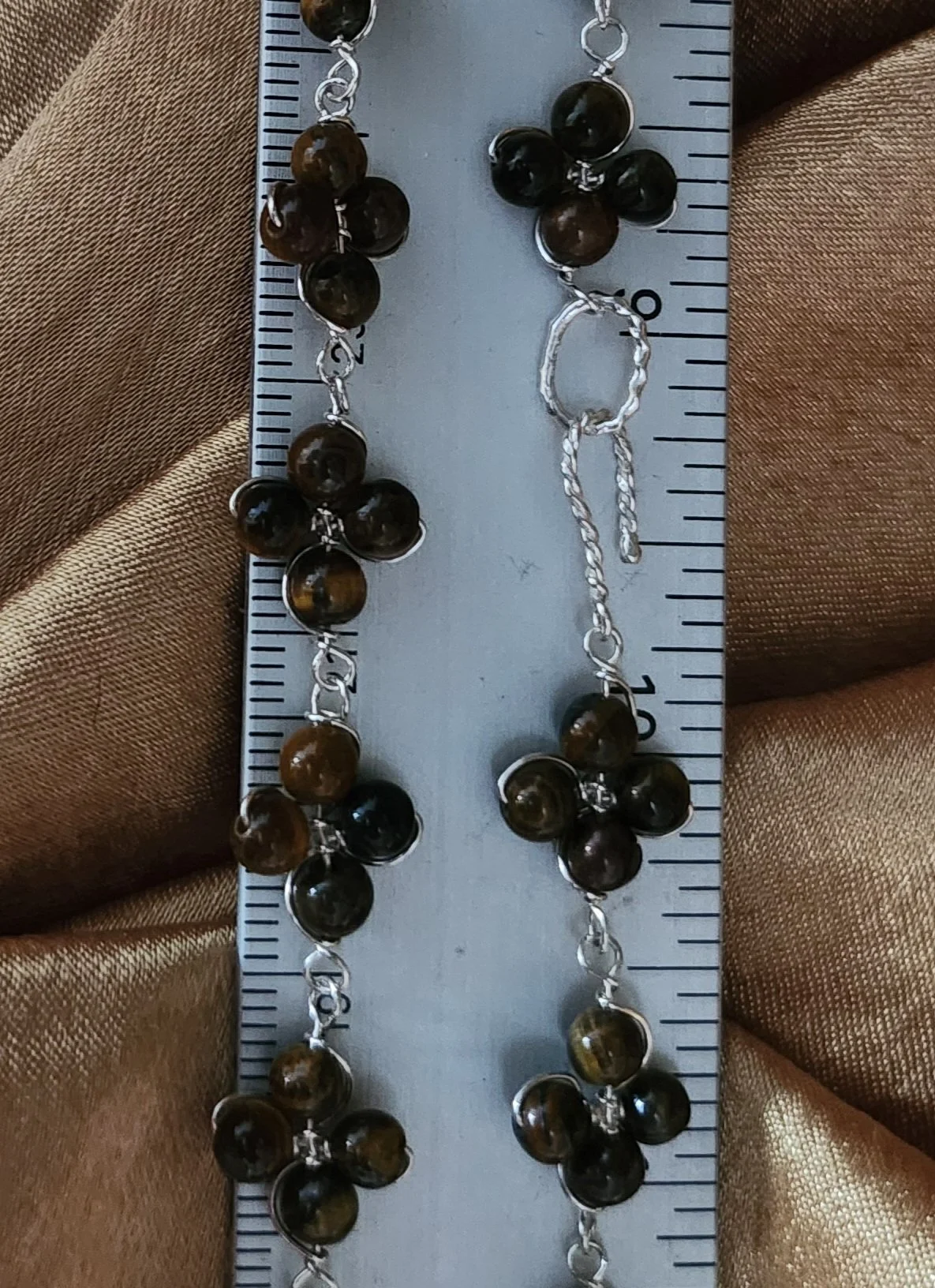 Each clover is meticulously wrapped in a single thread of .999 Fine Silver Wire, 4 individual Tiger’s Eye beads create each clover. This thoughtful design celebrates the beauty of nature and the power of connection.